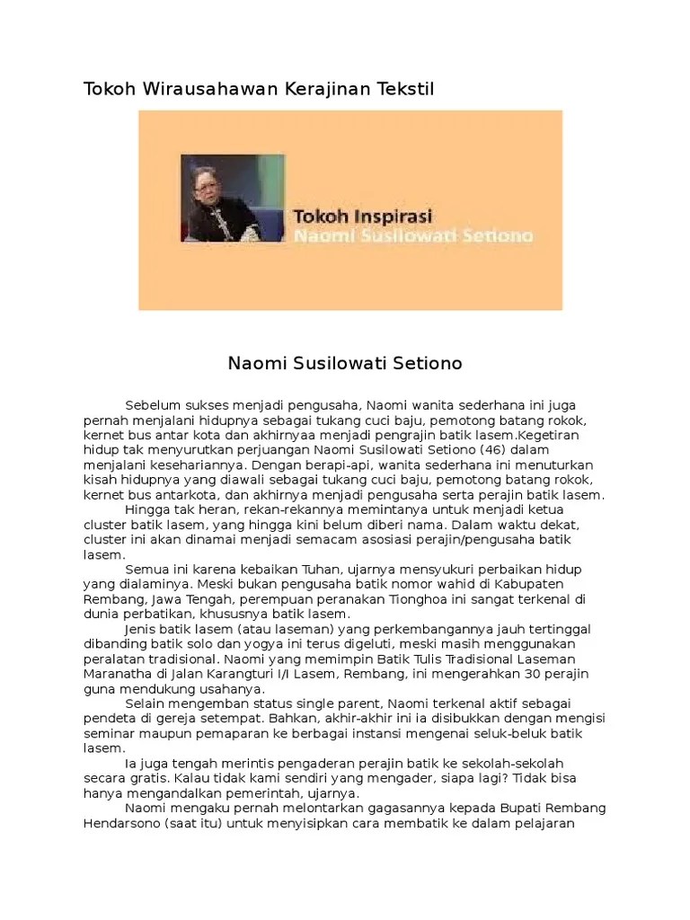 Salah satu wirausahawan yang sukses di bidang kerajinan adalah. Simak kisah naomi, tokoh wirausahawan di bidang kerajinan yang sukses · 1. Tugas presentasi kewirausahaan ( tokoh wirausahawan sukses dalam bidang kerajinan ) by : Komang adi bidang kerajinan : Meski naomi telah menjadi wirausahawan sukses di bidang kerajinan batik lasem dan sangat.